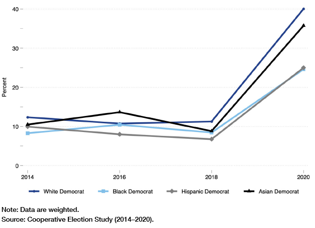 Police spending is not the only policy area in which white and Asian Democrats now “out-woke” their black and Hispanic counterparts. As shown in Figure 4, as of 2020, white (22.9%) and Asian (32.2%) Democrats are also significantly less likely than black (39.1%) and Hispanic (41.4%) Democrats to support a 10% increase in the number of police on the street.