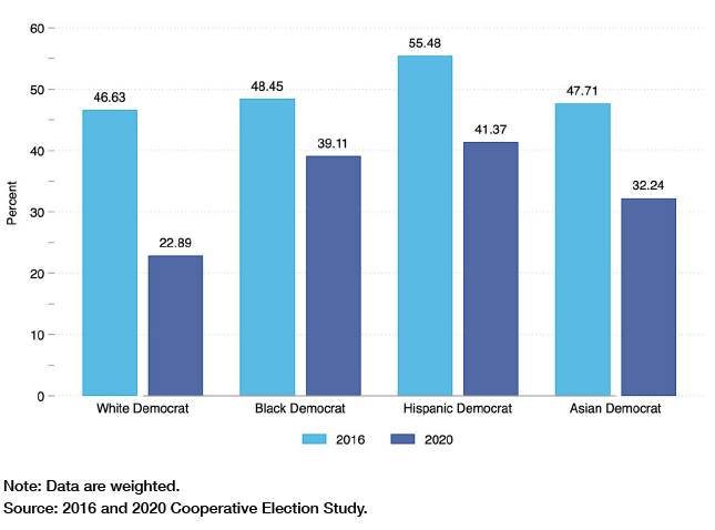 Finally, additional research is needed to better understand the nature of white Democrats’ policing policy attitudes. One possible experimental approach is to test whether, as earlier suggested, manipulating group-based feelings of guilt and shame affects whites’ support for defunding and depolicing policies. Another can examine whether, or to what extent, white Democrats’ support for these policies rests on overestimates of their support among their nonwhite counterparts. White Democrats—perhaps because they are mostly exposed to the sentiments of social media activists—may believe there are high levels of black and Hispanic support for defunding and depolicing policies, and these (mis)perceptions may, in turn, inform their own support for them. Future research can test this possibility by examining whether informing white Democrats of the actual rates of black and Hispanic Democrats’ support reduces or moderates their endorsement of “woke” policing policies.