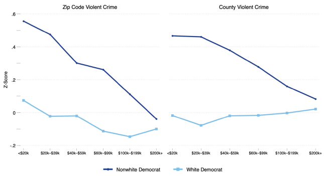It is also possible that white Democrats in high-crime areas are still socioeconomically better off than their nonwhite counterparts in ways that are not captured by conventional measures of family income, education, and stock and home ownership. While plausible, this account doesn’t explain why the adjusted attitudinal effects of violent crime were almost always significantly negative for Asian Democrats, who tend to outperform their white counterparts on various indicators of socioeconomic status (including those controlled for).