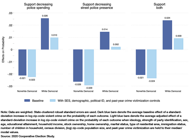 Figure 8A graphs the estimated baseline (dark blue bars) and covariate-adjusted (light blue bars) average marginal effect (AME) of a standard deviation increase in log zip-code violent crime on white and nonwhite Democrats’ probability of support for the policies. The estimated effects for white Democrats are entirely at odds with expectations. In the baseline models, the effects on each outcome are significantly positive, which indicates that white Democrats are actually more likely to support defunding and depolicing as local violent-crime levels increase. Indeed, on average, a 1-standard-deviation increase in log zip-code violent crime predicts a 2.6-point (p= 0.001) increase in the probability of supporting decreased state spending on law enforcement, a 1.4-point (p=0.030) increase in the probability of favoring decreases in the street police presence, and a 2.4-point (p=0.001) increase in the odds of endorsing both policies. These effects are reduced to statistical insignificance when all other covariates are held constant, but they remain positive, which is revealing, especially when examining the patterns for nonwhite Democrats.