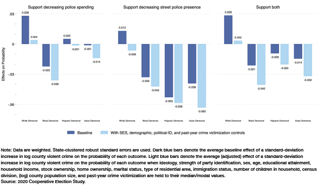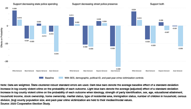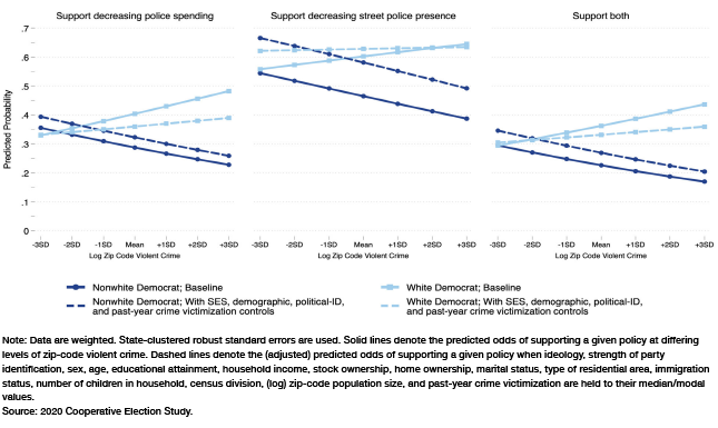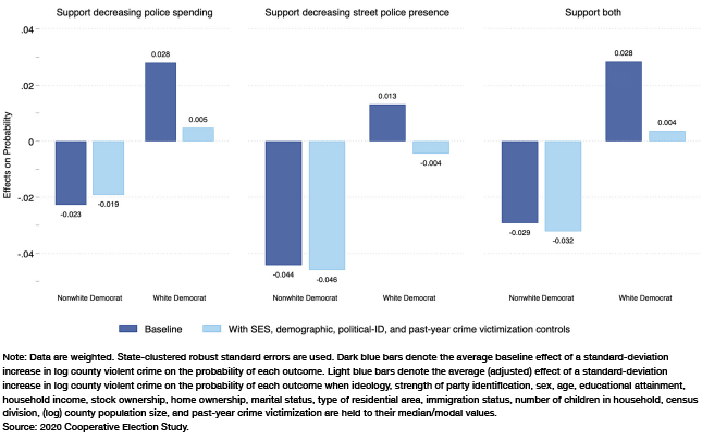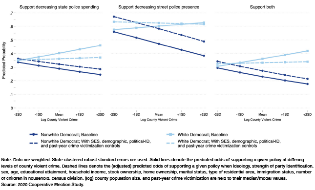 Section 3 finds that in areas with high levels of violent crime, support for defunding the police generally falls for all groups except white Democrats. This is true even when socioeconomic, demographic, and political background variables are held constant.