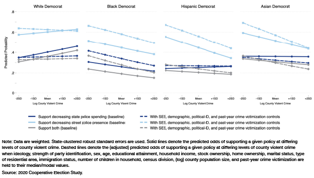 Another way to test the luxury beliefs thesis is to examine whether support for defunding and depolicing policies varies as a function of local violent-crime rates. Indeed, conservatives often suggest that those on the woke left are siloed in predominantly white and upscale communities that do not suffer the consequences of the policies they advocate for. This could explain why white Democrats are more supportive of depolicing than nonwhite Democrats, who may be at greater risk of criminal victimization, which defunding and depolicing policies threaten to exacerbate. If relative immunity from the consequences (i.e., increases in violent crime) facilitates support for these policies, we would expect to find that support among Democrats, including white Democrats, falls (rises) in places with higher (lower) levels of violent crime. Alternatively, as Henderson suggests, if those with higher SES are more able to “afford” the consequences of these policies in high-crime locales, levels of support among white and Asian Democrats may remain stable as crime increases. But if so, we’d expect that, when matched on all socioeconomic and demographic indicators, all groups will be less likely to support depolicing as crime increases, because the matched groups would be more or less equally capable of absorbing the policies’ costs.