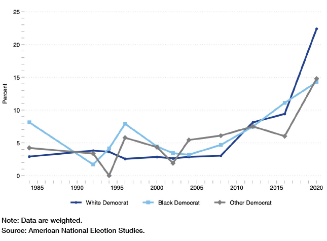 Figure 3 shows comparable ANES data from 1984 to 2020.[11] In 2016, 9.4% of 2016 white Democrats vs. 11.1% of black Democrats (and 7.1% of Hispanic and 0.6% of Asian Democrats) thought that federal spending on “dealing with crime” should be decreased. Four years later, in 2020, support for this position spiked, receiving support from 22.4% of white Democrats and 19.8% of Asian Democrats, compared with just 14% of black Democrats and 13.4% of Hispanic Democrats. Coincidently, support for increasing federal spending on dealing with crime fell 22.7 and 24.8 points, respectively, among white (from 57.2% to 34.5%) and Asian Democrats (69.9% to 45.1%) while declining by just 8.4 points among black (68.4% to 60%) and 12.2 points among Hispanic Democrats (68% to 55.8%).
