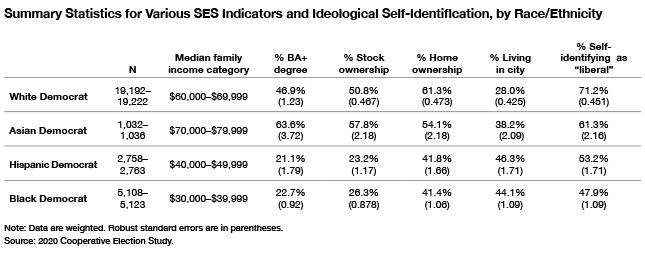 Summary Statistics for Various SES Indicators and Ideological Self-Identification, by Race/Ethnicity