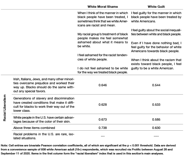 Bivariate Pearson R Correlation Coefficients Between Indicators of Racial Liberalism and Indexes of White Moral Shame and Guilt