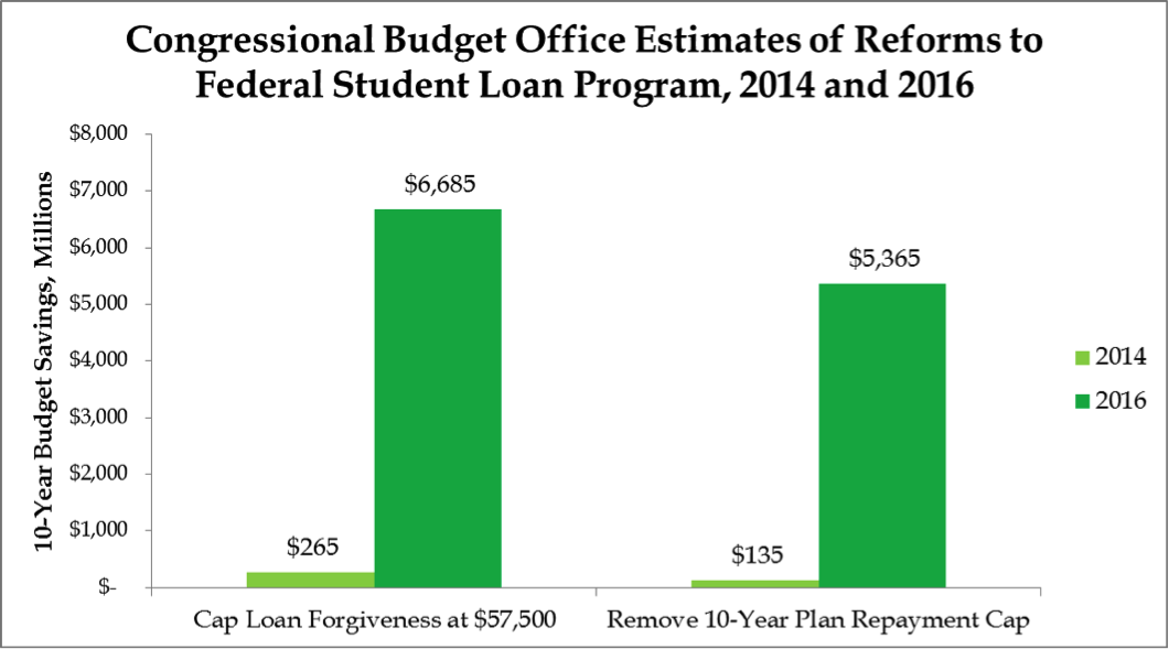 One proposal, to cap discharges under PSLF at $57,500 per borrower, was estimated to save $265 million in 2014. That estimate has since risen 25-fold to $6.7 billion. Another proposal would remove a feature of loan repayment plans that caps payments at lower amounts, thereby increasing the potential amount of forgiveness once the borrower reaches the ten-year PSLF threshold. That proposal, originally scored at $135 million, has seen its estimate rise 40-fold to $5.4 billion.