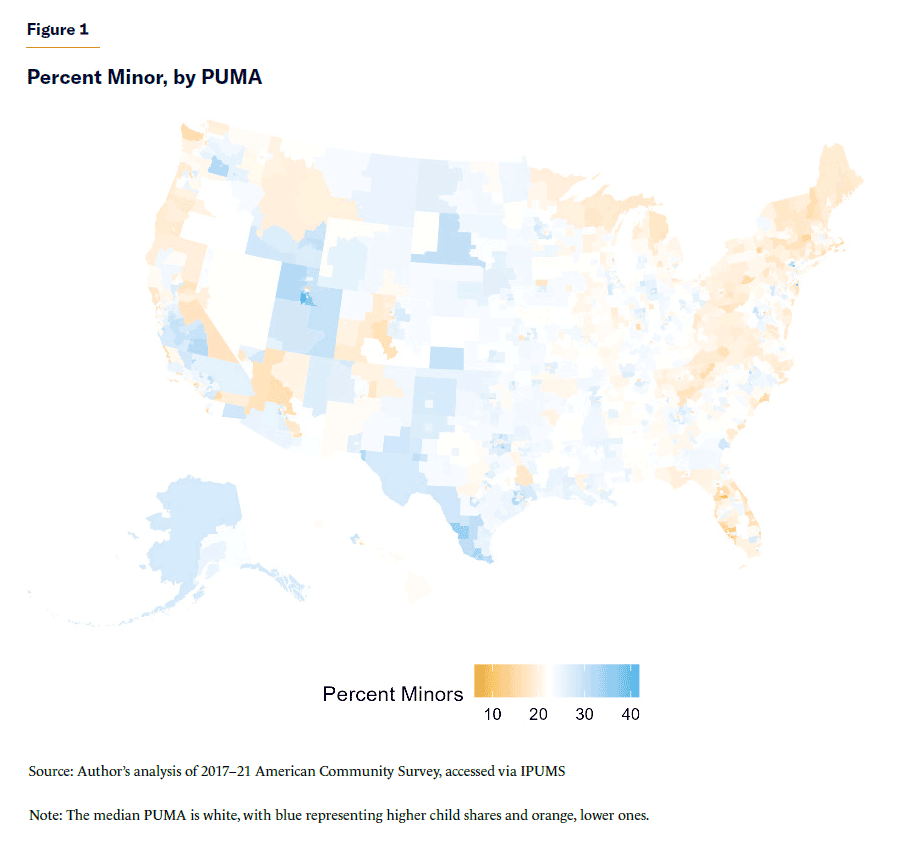 Most of this report will focus on numbers at the level of metro areas, but the large sample sizes of the American Community Survey, combined from 2017 through 2021, allow this fundamental statistic to be calculated at a much smaller level of geography, specifically “Public Use Microdata Areas” (PUMAs) containing only about 100,000–200,000 people apiece. This reveals an abundance of children in the middle of the country, with Utah standing out, and noticeable stretches of child-starved regions on the coasts (Figure 1).