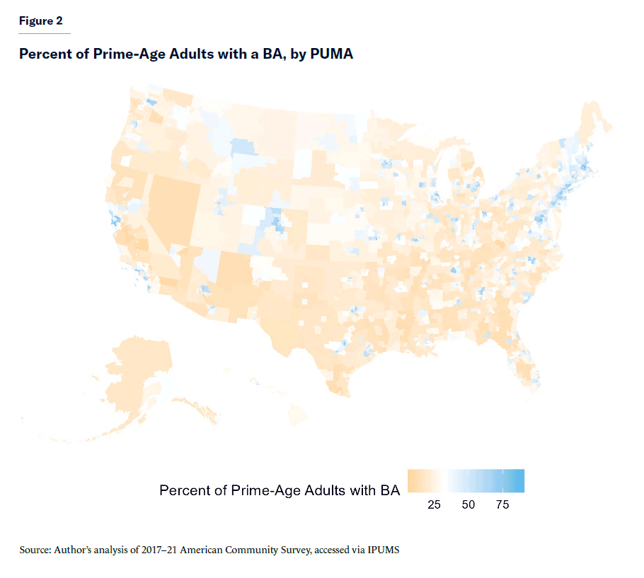 I created a PUMA-level map (Figure 2), similar to the one of the minor percentage of the population presented earlier, depicting the percentage of the 25–54 population who hold a BA in the 2017–21 ACS. As in the previous map, I set the median PUMA to show up as white—and recall that PUMAs are designed to have roughly the same population. But since the high-BA areas are so much denser, approximately the same number of people occupy a smaller geography, and thus, the orange areas swamp the blue areas on the map visually. The D.C.-to-Boston corridor along the East Coast especially stands out.