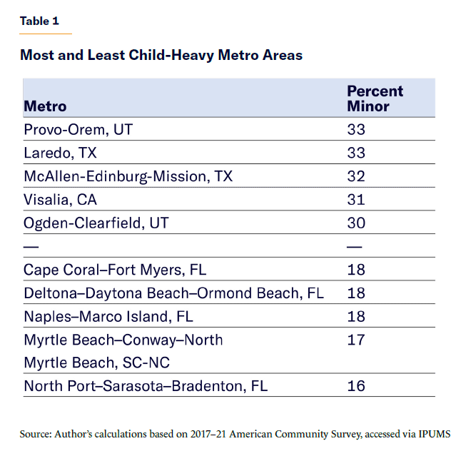 Moving up to the level of metro areas, Table 1 lists the most and least child-dominated metros with at least 250,000 population.[23] (The smaller Punta Gorda, Florida, metro area wins the least-children contest without that restriction. Generally, numbers for smaller metros are measured less precisely, and 250,000 serves as a decent proxy for whether the average reader might have at least a passing familiarity with the place.) For this and similar tables later in the report, I provide the top and bottom of the list, with the middle excluded, with the full rankings available for download.[24] Interestingly, the bottom of the list is dominated by aging areas rather than big-city metros; less surprisingly, the higher-fertility Mormon and Hispanic populations are strongly represented in the metros at the top of the list.
