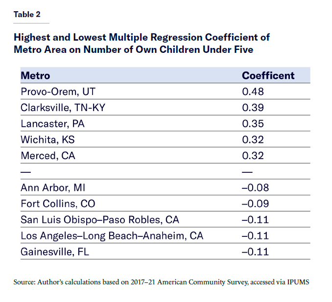 Last, I analyze how many kids under age five are living with each woman aged 16–49 in the data set, not merely asking which metros have the most fertile populations (which would be mostly redundant with the minor-share-of-population analysis presented above) but statistically controlling for a myriad of demographic variables—specifically, age, race, ethnicity, ancestry, state or foreign location of birth, and education level. This analysis does not necessarily prove that certain metro areas cause new births or fertile young families to move in from elsewhere, but it shows which metros have more young children than one would expect from the demographics of local women in the age range where women are most likely to be bearing and raising young children. I focus on women, of course, because they are typically most likely to have the children in the event of a breakup or to be raising children alone for other reasons, and therefore the number of under-five kids living with a woman is a very good indicator of her recent fertility.