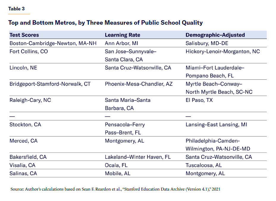 Which metros have the best and worst education thus depends on how one prefers to conceptualize good education (Table 3). In the cross-correlations, most of the relationships are rather weak, though the minor share of the under-55 population is higher in places with low test scores (–0.38), and net child migration is higher in places with slower learning rates (–0.27). City-to-suburb movement likely takes kids to places with better schools, but the metro-to-metro moves captured in my data show little sign of this.[31]