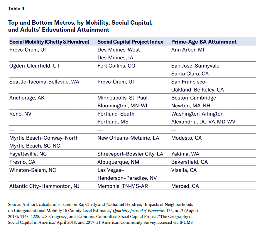 Relatedly, Senator Mike Lee’s Social Capital Project aggregated numerous signs of social capital[34]—such as family unity, philanthropy, and strength of friendships—into a public index. A less intricate, but still commonsensical, measure of social capital is simply the proportion of adults in each metro who hold BAs. These I calculated from the ACS data discussed above, restricted to those aged 25–54.