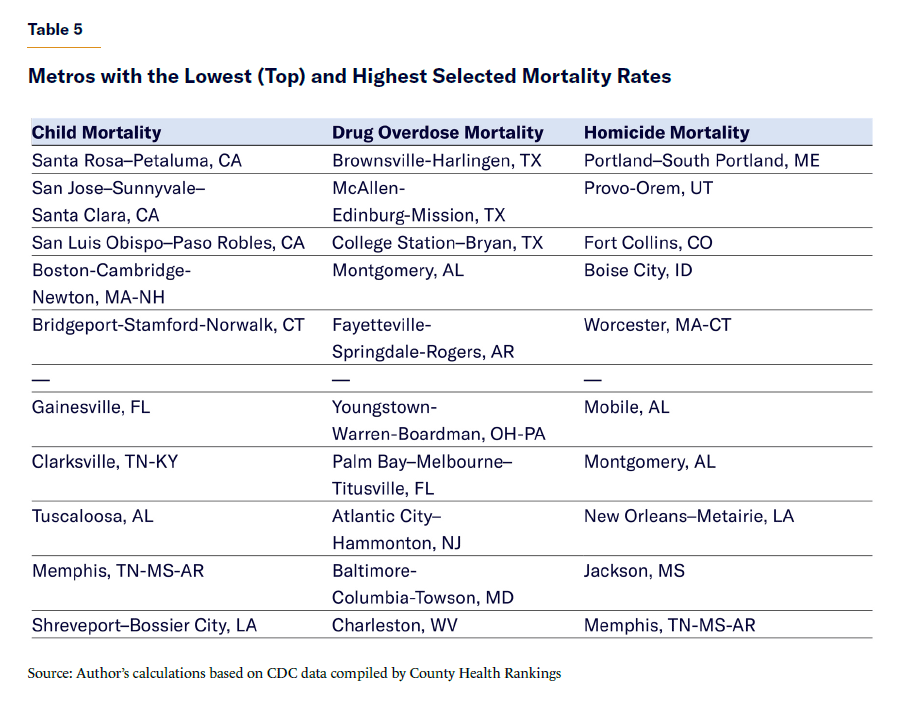County Health Rankings, a project of the University of Wisconsin Population Health Institute,[37] compiles and updates a variety of statistics at the county level. Three are key mortality rates drawn from 2014–20 CDC data, which paint a picture of children’s health and the crime and social dysfunction that surrounds them in the broader population: child mortality, drug overdose mortality, and homicide mortality (Table 5). The top listed metros have the lowest death rates.