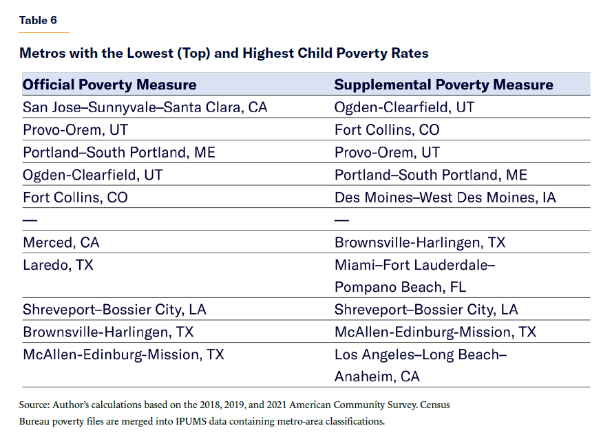 Since the measures capture different aspects of poverty—specifically, a lack of cash measured in the national context vs. a lack of total resources after considering local housing costs—I present both (Table 6).[42] The Census Bureau did not measure SPM at all in 2020, owing to the pandemic’s effects on survey work, so I calculated metro-level child poverty rates over the years 2018, 2019, and 2021. (I left out 2017, to avoid giving so much more weight to the pre-pandemic status quo than is the case for my other ACS variables.) The top listed metros have the lowest poverty rates.