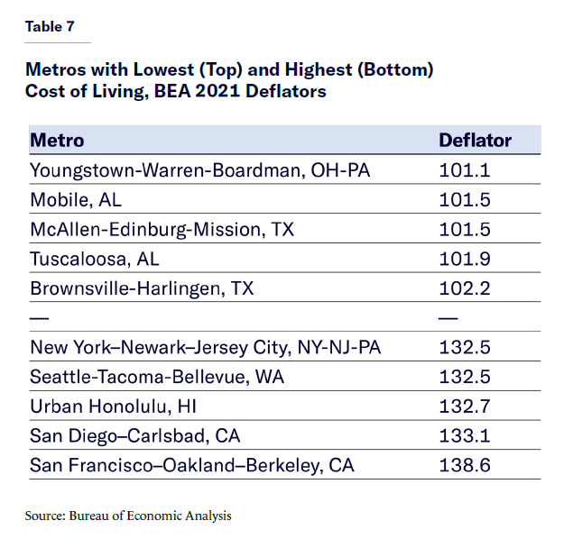 Child poverty is the last topic in this section—but not because it is the least important. Instead, I discuss it here because the differences between OPM and SPM illustrate an overriding fact about my data set: cost of living is a powerful variable that, beyond complicating any analysis of metros’ economic pros and cons, seems to have a lot of explanatory power in and of itself. Let’s explore that concept in more detail.
