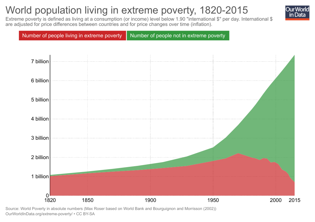 As the figure below from the Our World in Data project shows, the reduction in extreme poverty on a global scale is recent. The default mode for much of human history was poverty with its associated problems. Only since about 1970 has there been a rapid growth in the number of people living above the extreme poverty line and a drastic reduction in the number of people living under it. In 1970, about 60 percent of the 3.7 billion people living on this planet were still relegated to extreme poverty. Now, the figure is under 9 percent.