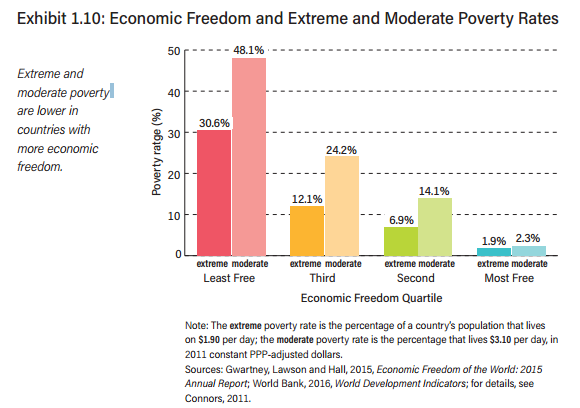 The expansion of economic freedom has coincided with the impressive reduction in global extreme poverty, and nations that have embraced economic freedom have seen substantial reduction in the share of people living in destitution. As the Economic Freedom of the World report from the Cato Institute shows, the most free countries have the lowest levels of poverty, while in the least free countries high levels of poverty persist.
