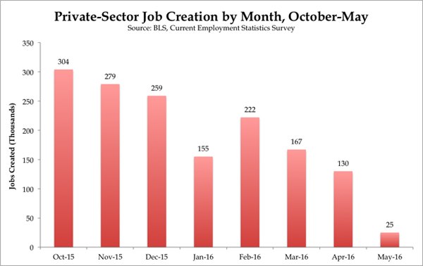 The economy created only 25,000 private sector jobs in May, a precipitous decline from prior months. That makes the seventh month in a row that job creation has declined. These data match the decline in GDP growth, from 2 percent in the third quarter of 2015, to 1.4 percent in the fourth quarter of 2015, to 0.8 percent in the first quarter of 2016, spurred by the decline in nonresidential fixed investment.