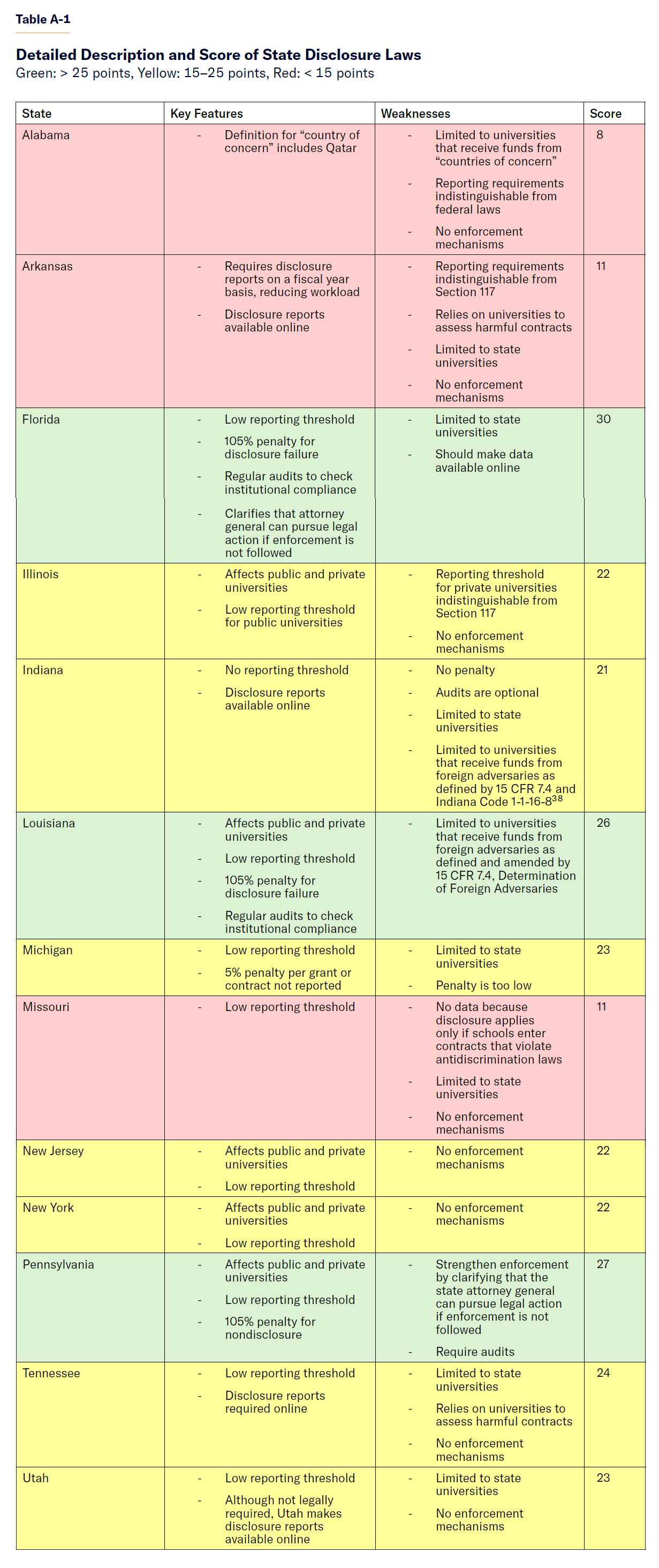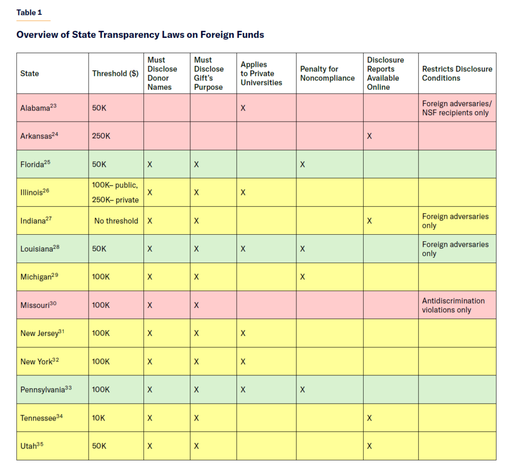 Following these investigations and heightened concerns regarding foreign influence, particularly from China, lawmakers made foreign funds transparency a higher priority. At the federal level, the CHIPS and Science Act of 2022 (Section 10339B) requires National Science Foundation (NSF) recipients to report any foreign contributions of $50,000 or more from foreign adversaries.[14] More states also adopted transparency laws: Arkansas (2021), Florida (2021), Tennessee (2021), Indiana (2022), Louisiana (2023), and Alabama (2024).