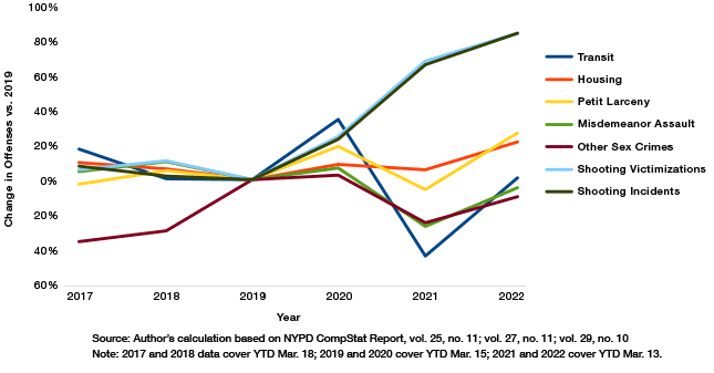 Figure 1-A shows trends in the number of non-index offenses from January 1 through approximately the first two and a half months of each year, 2017 through 2022. To depict all the offenses on the same scale, 2019 is treated as the baseline, and offenses are reported as the percentage difference between each year and 2019. Thus, all the offenses appear as 0% for 2019.