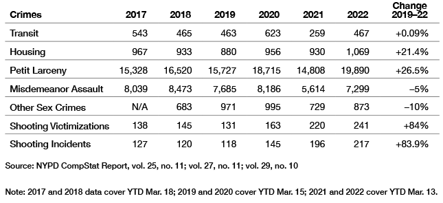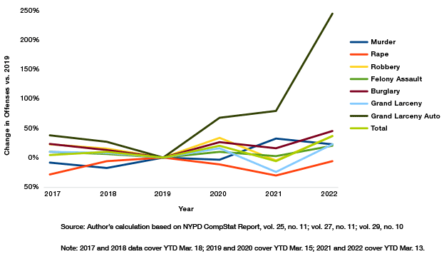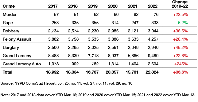 The increases between 2019 and 2020 clearly show the impacts of the release of more than 2,000 inmates from city jails.[26] After decades of constant, methodical decline in almost every crime category, crime in all the categories for which inmates had been released due to the new bail laws went up.[27] In just the first two and a half months of 2020, according to NYPD CompStat reports, more than 3,000 more crimes had been committed, compared with the same period just a year earlier. That included 755 more robberies, 351 more felony assaults, 536 more burglaries, 1,221 more grand larcenies, and 532 more car thefts. The only thing that temporarily stopped the rise was the Covid pandemic—and, even then, victimization continued to increase when adjusted for the amount of time people spent, for example, in public or on the subways.[28] When the economy opened up more fully in 2022, crime by more traditional measures resumed its rise, climbing from 16,707 index crimes in the first two and a half months of 2019 to 22,824 during the same period in 2022, a combined rise of 36.6% in index crimes.[29]