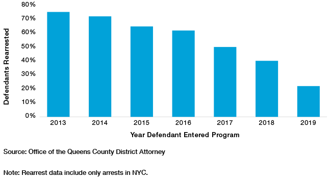 In May 2019, the Office of the Queens DA conducted an analysis of the program. It followed the Queens SR defendants during the period between disposition and sentence and for a five-year period thereafter. The office found that the defendants enrolled in 2013 had a rearrest rate of 75% (Figure 2), with an average of five arrests each by May 29, 2019. Of all the defendants enrolled in the program between 2013 and 2019, they had a rearrest rate of 51%, with an average of 3.4 arrests each. Some 44% of the rearrests were for felonies. This included rearrests both while enrolled in the program and after completion of the program.[51]