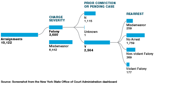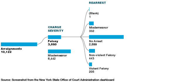 First, we look at all felony arraignments in that period in NYC (Figure 3). There were 3,680 felony arraignments in NYC between July 1, 2020, and August 31, 2020. Of that group, 981 (27%) of them were rearrested before their case was disposed, 5.6% of them for a violent felony.