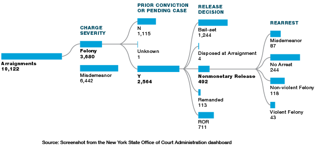 The data cover cases arraigned from January 1, 2020, when the 2019 bail law took effect, to June 30, 2021. The site tracks those cases to the latest date for which they have available statistics, which is September 17, 2021, at the time of writing. The site contains excellent tools that allow researchers to select data points and date ranges to examine how cases have been handled under the new bail regime.