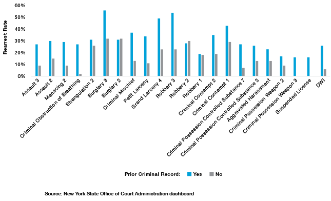 The chart (Figure 6) below illustrates the rearrest rates for defendants with prior convictions or pending cases compared with those with no priors, grouped by arraignment charge.