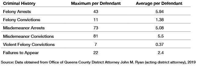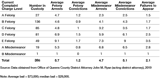 On June 6, 2019, the Queens County District Attorney’s Office conducted an analysis of the county defendants awaiting trial in NYC jails who were being held solely because they could not make bail. (Excluded from this analysis were defendants being held on other non-bail holds, such as remand, out-of-state warrants, or parole and probation violations, or those defendants serving a city sentence.) There were 398 defendants held solely because they could not post bail. Table 1 shows their criminal background.