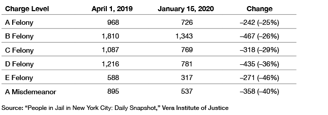 The day the 2019 bail law was passed, NYC jails held 7,822 inmates, about 5,209 of them being held pretrial. On January 1, 2020, there were 5,809 inmates—a reduction of more than 2,000 inmates (approximately 40% of the pretrial detainees) in just eight months, most occurring in the last few months of 2019. The predictions were correct. The legislature and advocates knew exactly what they were doing. The number of defendants being held on misdemeanors and nonviolent felonies fell dramatically, as shown in Table 3.