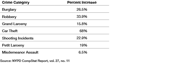In mid-March 2020, Mayor Bill de Blasio began to close various portions of the city—schools, bars, restaurants, businesses, cultural facilities—and subway service became limited.[22] By June 28, 2020, major crime overall in NYC actually decreased 2.83%, fueled almost entirely by a reduction in grand larcenies, the most numerous felony index crime, which fell 20.3%. This was largely the result of people not leaving their houses for work or shopping, thus being unavailable as crime victims.[23] Petit larceny, mostly consisting of shopliftings, went down 7.2%—again, fueled mostly by store closings in the early stages of the pandemic. But the rise in other crimes continued: murder rose 23.1% YTD over 2019; burglary rose 45.8%; car theft rose 60.8%; and shootings rose 43.9%.[24] These are percentage increases in these crimes not seen in decades, following nearly three decades of crime reductions in NYC.[25]