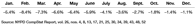 The change in crime patterns from 2018 to 2019 was most noticeable in car theft, which declined 12.5% in April 2019, compared with the same period in 2018, yet declined just 0.2% by December 2019, compared with the same period the year before. Burglary went from a 14.5% reduction in April 2019 to an 8.9% reduction by December 2019. Grand larceny went from a 5.5% decline in April 2019 to a 1.4% decline by December 2019. And petit larceny, which declined 0.6% in April 2019, compared with the same period in 2018, actually increased 3.2% in December 2019, compared with the same period the year before.[21] All these crimes became non-bailable under the 2019 reforms.