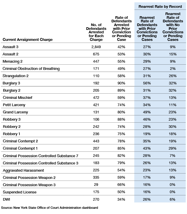 In Table 8 below, the latest rearrest data at the time of writing are broken down by crime and criminal record. The first column shows the current arraignment charge, the second column shows the number of defendants arrested for that crime in the time frame, and the third column shows the percentage of those defendants who had a prior conviction or pending case at the time of their arraignment, ranging from a low of 34% for DWI to a high of 90% for Burglary 3 (commercial burglaries). The fourth and fifth columns show the rearrest rates for defendants with no prior arrests or pending charges versus those with prior convictions or pending charges at the time of their arrest. The rearrest rates are substantially higher for every crime where the defendant has priors.