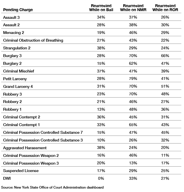 An analysis of Office of Court Administration (OCA) data shows that 69.7% of city defendants arraigned on felony charges between July 1, 2020, and August 31, 2020, had a prior conviction or a pending case, and 30% of those defendants got rearrested while their case was pending. If they had a prior conviction or pending case and the judge found them to be a risk of flight, 45% of them were rearrested while their case was pending. The rearrest rates for this latter group run as high as 70% for commercial burglary, robbery third degree, and grand larceny, and 79% for petit larceny—all non-bailable offenses.[6]