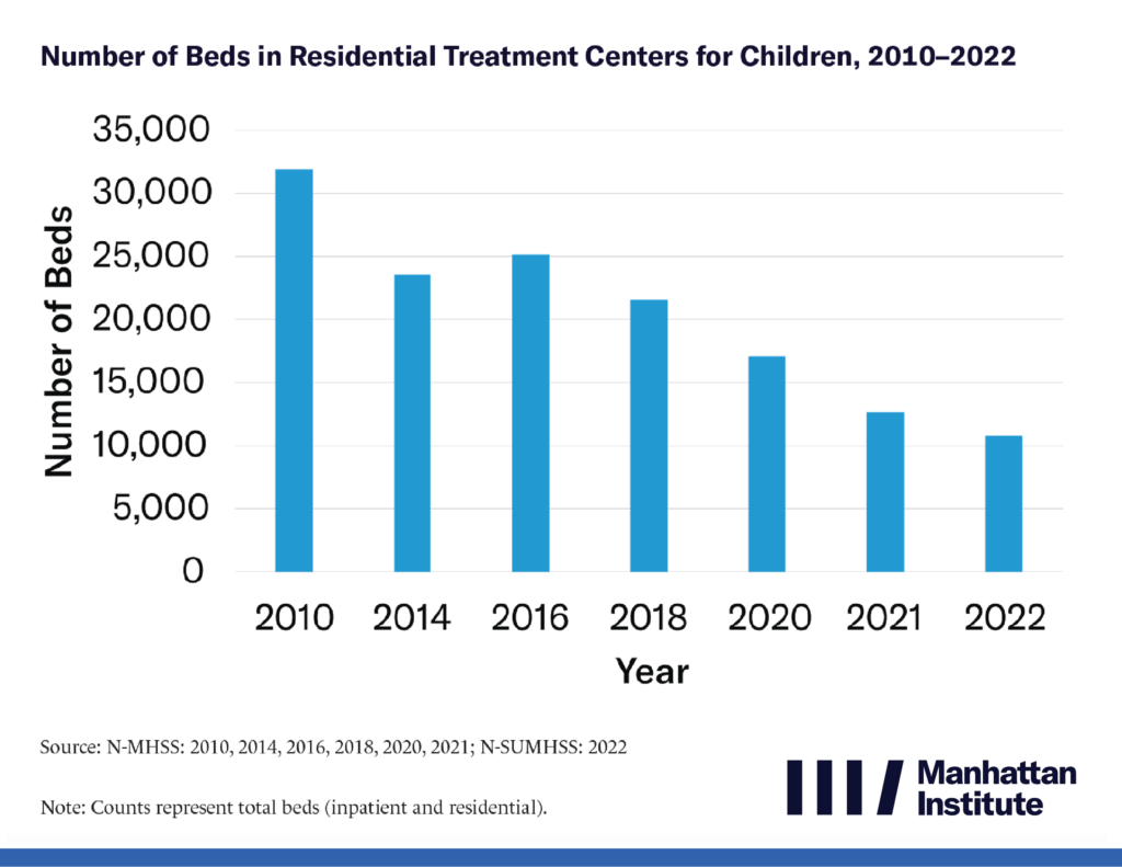 High-quality youth residential mental health treatment programs, which are less intensive than hospitalization but more intensive than outpatient services, have been shown to improve mental health outcomes. However, since 2010, activists motivated by isolated incidents of abuse and neglect have pushed policies that have decreased the number of beds by 66.2%. The declines have been driven not by evidence of failure but by ideological opposition to this mode of treatment. Dziengelski finds these decreases coincide with an assortment of adverse outcomes including rising rates of suicide, usage of psychiatric hospitals, emergency department boarding, and criminal justice involvement.