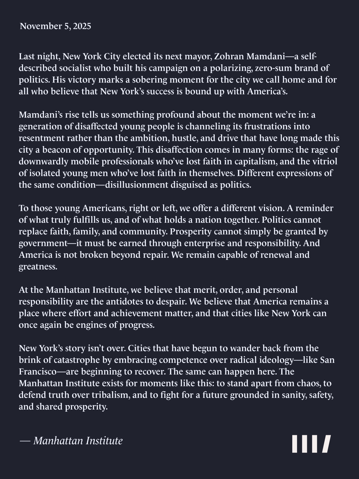 On Tuesday, New York City elected self-described socialist Zohran Mamdani as its next mayor. As we wrote the morning after the election, “Mamdani's rise tells us something profound about the moment we’re in: a generation of disaffected young people is channeling its frustrations into resentment rather than the ambition, hustle, and drive that have long made this city a beacon of opportunity.” Mamdani’s victory is sobering—it shows that a sizable share of New Yorkers now identifies with that vision of politics. But the Manhattan Institute exists to champion another: one grounded in merit, order, and personal responsibility. We will continue to fight for New York’s future, just as we have fought—and prevailed—in other cities that once flirted with Mamdani-style radicalism but are now turning the tide. The same can happen here.