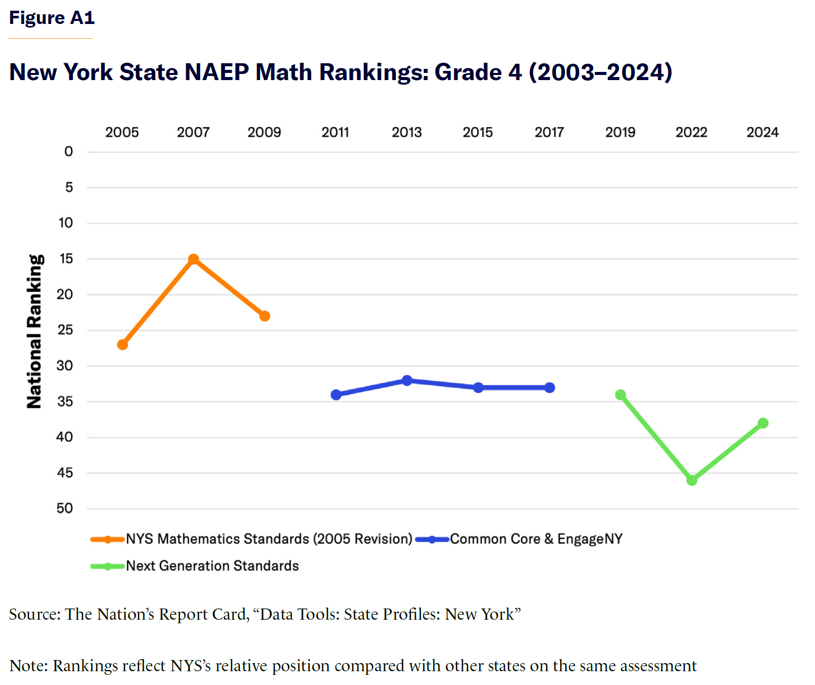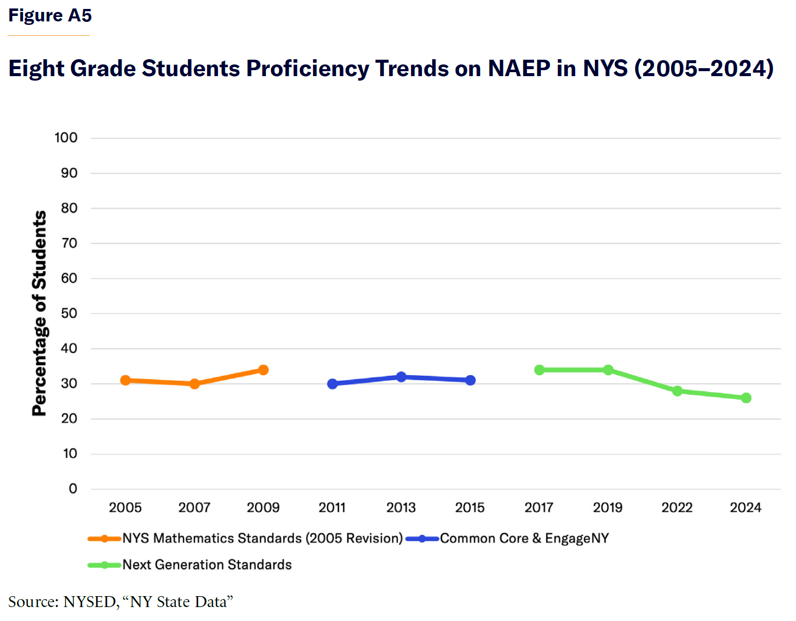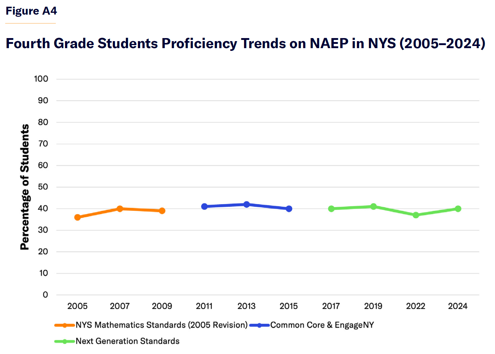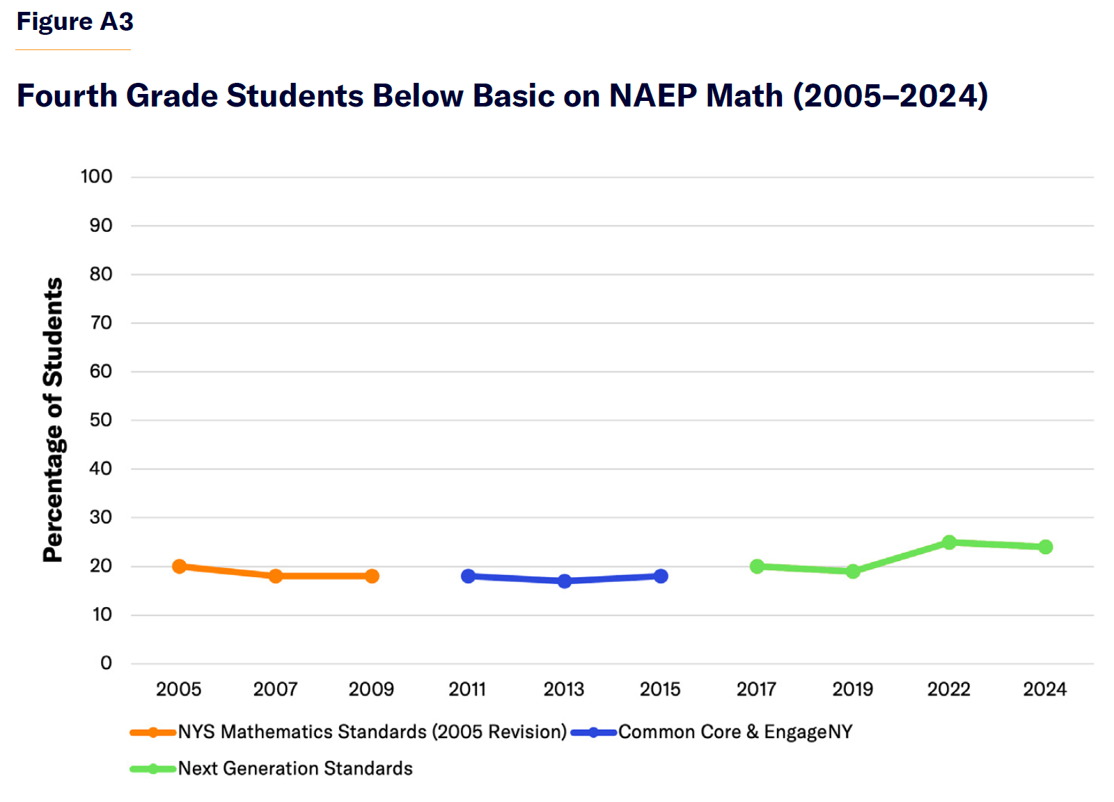NAEP’s “below basic” category captures students who have not demonstrated mastery of grade-level math and lack foundational math skills. Figure A3 displays the percentage of NYS fourth-grade students scoring below basic in math across standards-reform cycles.