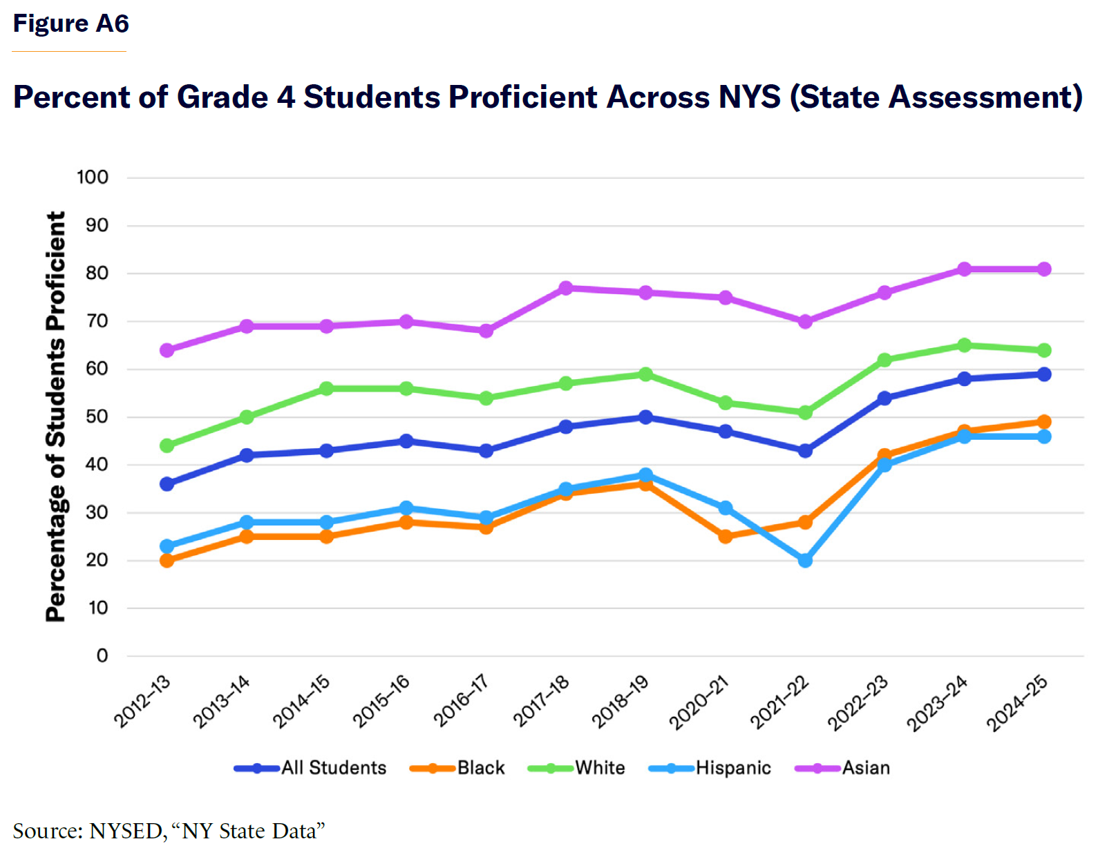 Figure A6 displays Grade 4 NYS math assessment proficiency rates by race for available assessment years, from 2012–25.