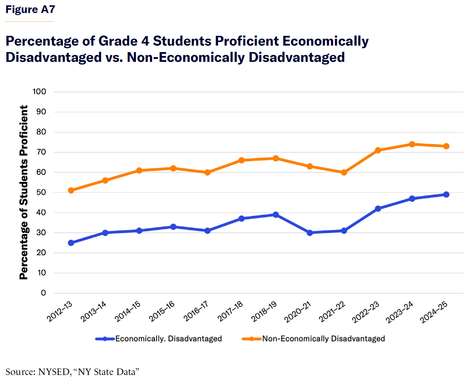 Figure A7 shows Grade 4 NYS math assessment proficiency rates by economic status.