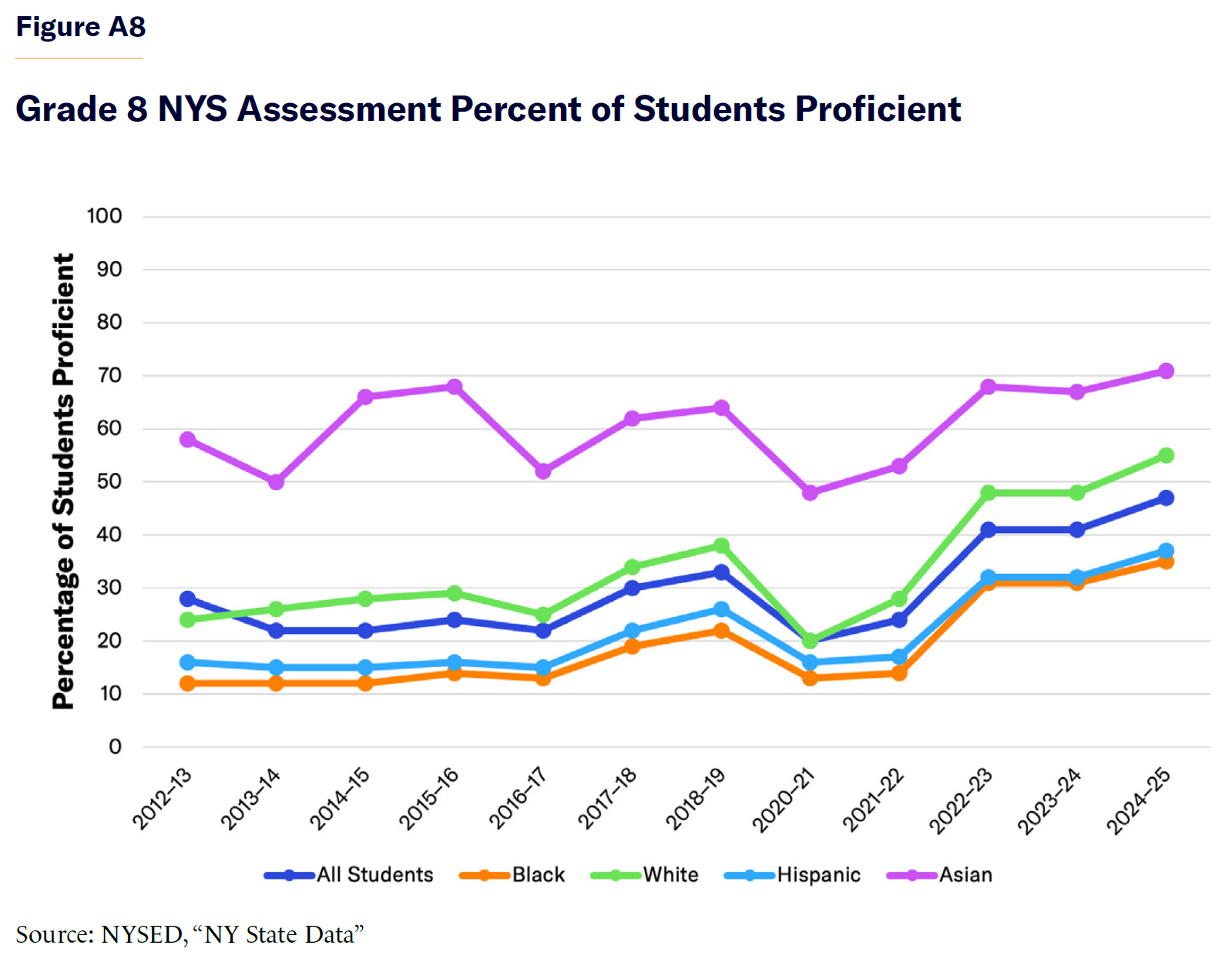 Figure A8 shows Grade 8 NYS math assessment proficiency rates by race.