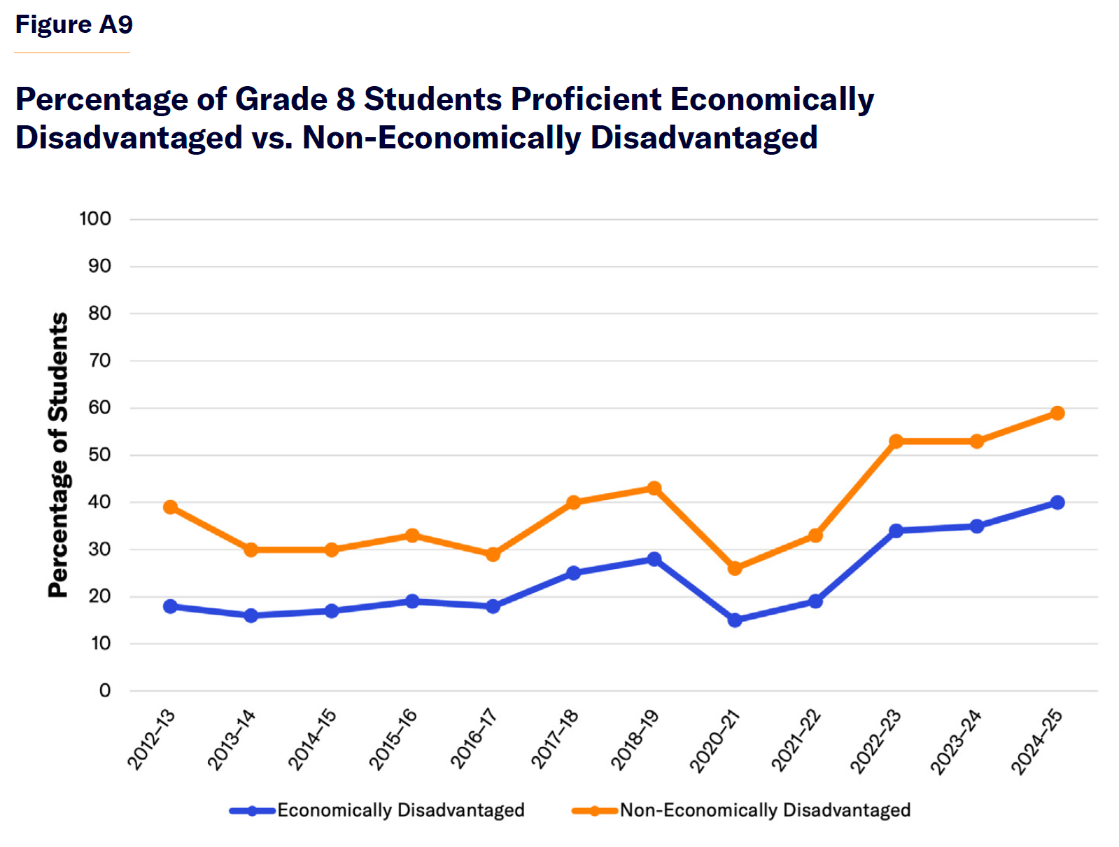 Eighth-grade state assessment trends are comparable. By 2024–25, 47% of students statewide had met proficiency standards, but the rate was substantially lower among black (36%) and Hispanic (37%) students than among white (55%) and Asian (71%) students. Economically disadvantaged eighth-grade students continued to score well below their peers, with only 40% reaching proficiency, compared with nearly 59% of their peers. Students with disabilities improved modestly from the year before, rising to 21% proficient, but still fare markedly worse than general education students.