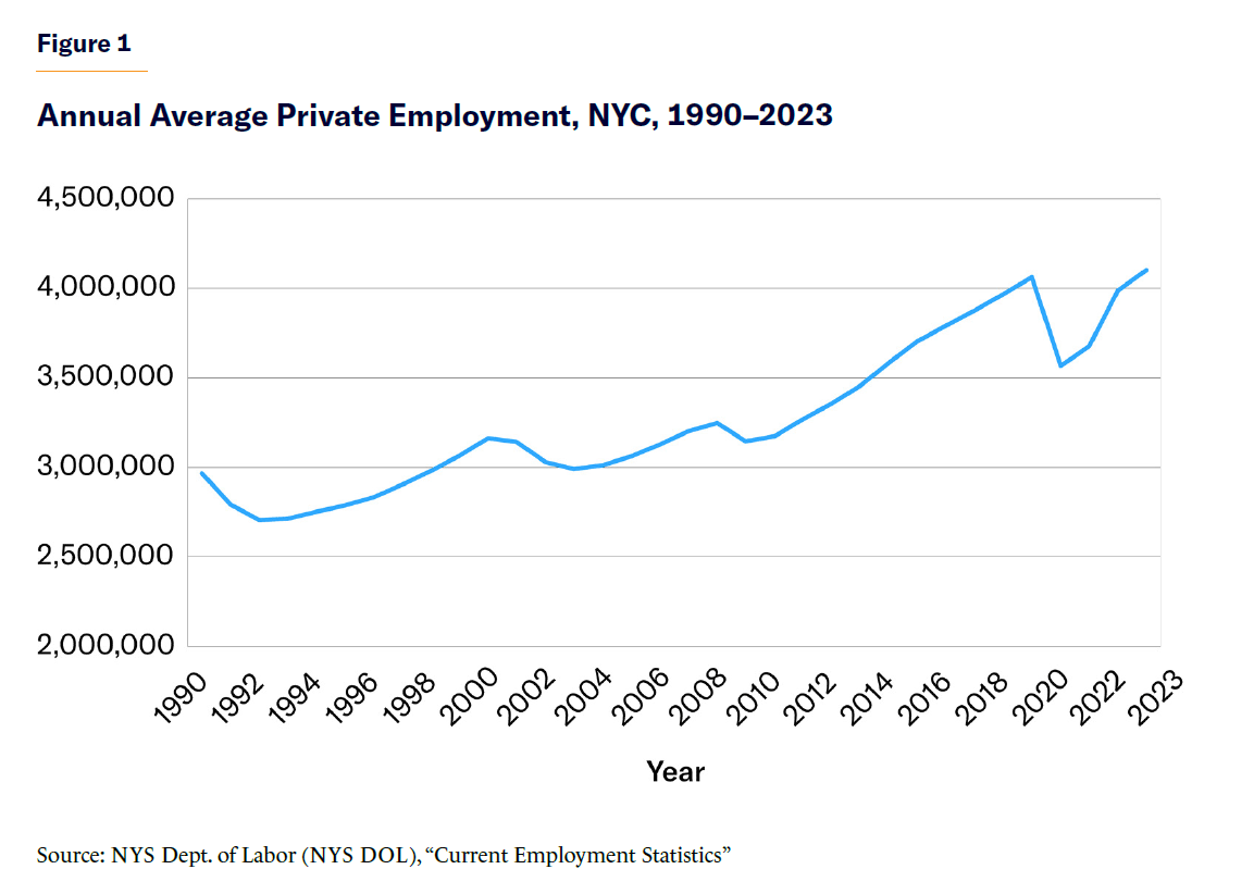 Figure 1 shows the growth in annual average NYC private employment since 1990. From a level below 3 million in 1990, private employment has grown by more than a third, passing 4 million for the first time in 2019. After a large dip during the pandemic-induced recession, private employment fully recovered and stood at a record 4.1 million in 2023.