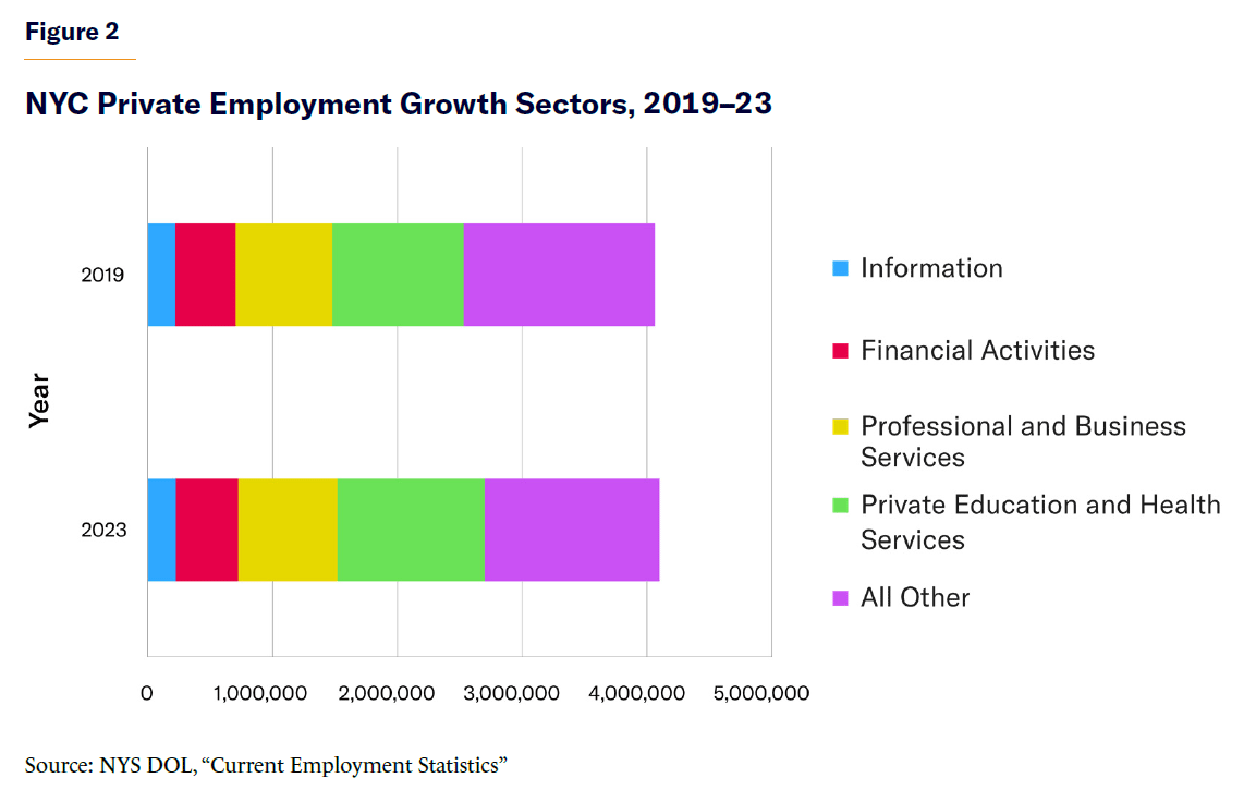 Newly released New York City employment data present a mixed picture. In 2023, the city attained record private employment, more than recovering from the pandemic-induced dip after 2019. However, the way that growth was attained raises important questions for policymakers. Some of the growth occurred in the information, finance, and professional- and business-services sectors, which have powered NYC’s office-based economy for decades. These sectors mostly employ college graduates. Sectors that traditionally employed many non-college graduates, including construction, retail, and leisure and hospitality, are still below the levels of 2019. New, rapidly growing industries—home care and social services—are substituting for those lost jobs. However, those sectors are only nominally private employment; job growth is largely publicly funded and an outgrowth of policies that likely are not sustainable over the long term.