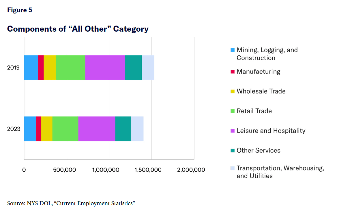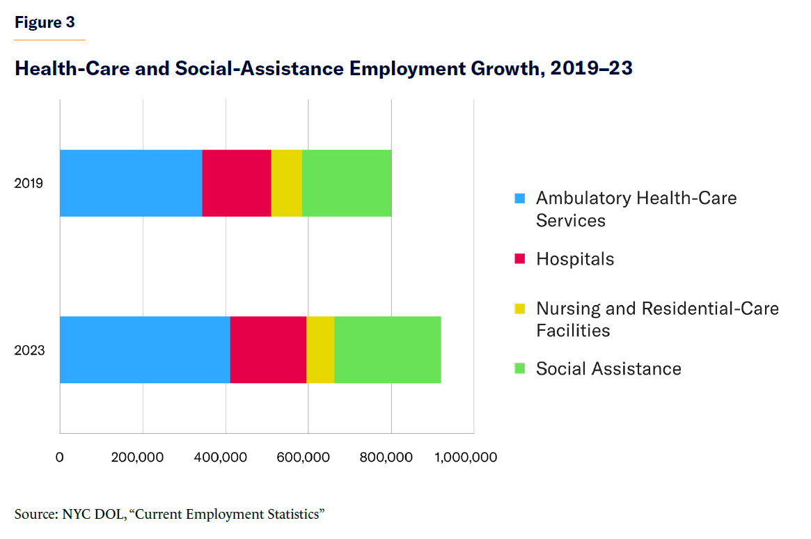 Because the tax burden is already so high, the state and city will be under continual pressure to cap the growth of home-care and social-services spending. Thus, these sectors are unlikely to support much future job growth. New York governor Kathy Hochul’s fiscal year 2025 Executive Budget Briefing Book notes that “managed long term care enrollment is projected to increase by 10 percent in FY 2025, and spending is expected to increase by 20 percent. Both of these trends are unsustainable.”[17] The executive budget proposes $200 million in savings in the state’s upcoming fiscal year, which was received unfavorably by state legislators.[18] Notwithstanding this year’s budget outcome, uncertain at the time of writing in early April 2024, the “unsustainable” rate of growth is not likely to be sustained much longer, due to action either at the state, or the federal, level to rein in costs.
