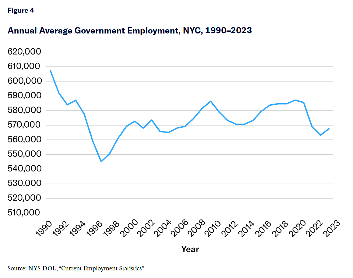 While government-funded private-services employment has been rising, federal, state, and local government payroll employment has fluctuated within a narrow range for decades and has been falling in recent years (Figure 4). The drop is mainly attributable to local government, which peaked at 495,000 jobs in 2019 and was down to 479,000 in 2023. New York State and City are effectively substituting private contract jobs for public payroll workers, saving on wages, benefits, and pension costs by doing so.