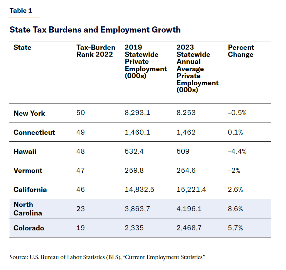 The relationship between state and local tax burden and employment growth is complex; taxes are important, but not the only factor influencing growth. To be decently fast-growing, one’s state does not necessarily need a very low tax burden, but just a middling one. However, being in the top tax-burden group seems to represent a drag on private employment growth. Three of the four top-ranking states by tax burden have yet to recover their 2019 private employment. Table 1 shows the top five states, by tax burden in 2022, and their private employment growth between 2019 and 2023. Two faster-growing middle-ranking states, North Carolina and Colorado, are shown for comparison. Private employment grew by 3.9% nationally between 2019 and 2023.