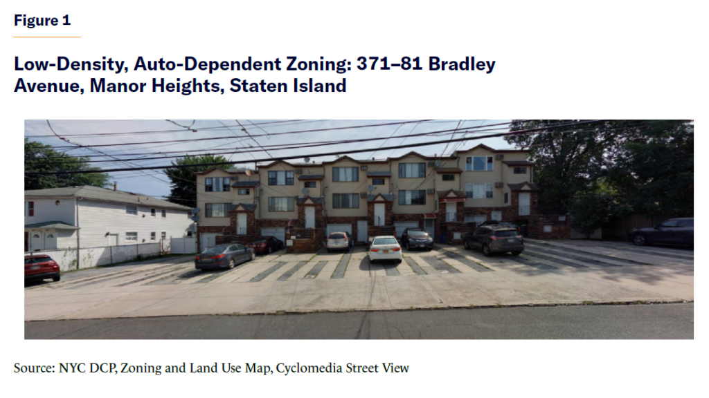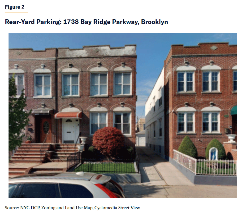 As an illustration of this problem, the NYC DCP study[17] and presentation materials used a group of five, ostensibly two-family homes at 371-81 Bradley Avenue in the Manor Heights neighborhood of Staten Island (Figure 1). Three electric meters are visible from the street for some of the buildings, and the development may contain as many as 15 units. The front yard effectively was converted into a large parking lot, eliminating all on-street parking that otherwise might be available to nonresidents, and creating an aesthetically unappealing streetscape.