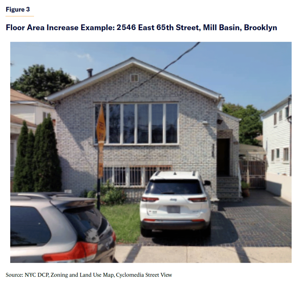 We can see the effects via an example of a 4,000 square foot, 40’ x 100’ lot in an R3-1 district. This district permits detached and semidetached (i.e., attached to another house on only one side) one- and two-unit homes.[46] Current zoning permits 0.6 FAR, or 2,400 square feet of floor area. This floor area would likely be developed in a detached two-story, two-family home, with one unit above the other. Figure 3 shows an example of such a house, located in an R3-1 district in Mill Basin, Brooklyn.