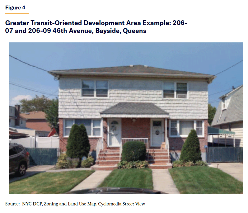 In the Greater Transit-Oriented Development Area, a subset of low-density districts that are relatively well served by transit (either subway or commuter rail),[47] the Adams administration’s proposals go further, making teardowns more likely. Floor area increases would be larger for “qualifying sites” of over 5,000 square feet.[48]